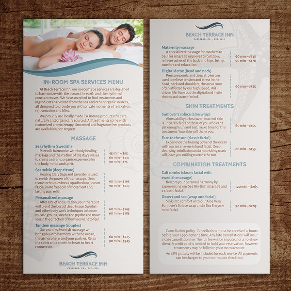 San Diego Beach Hotel In Room Spa Menu Menu Contest 99designs